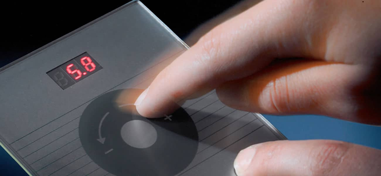 Bereits durch leichte Berührung der glatten Oberfläche wird eine einfache Steuerung ermöglicht. Ein Drehimpulsgeber in kapazitiver Ausführung erkennt die Betätigungs-Signale und gibt diese über eine Schnittstelle an die Maschinensteuerung weiter. Die digitale Anzeige kann hierbei frei programmiert werden, um eine individuelle Zuordnung unterschiedlichster Messgrößen zu gewährleisten.